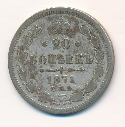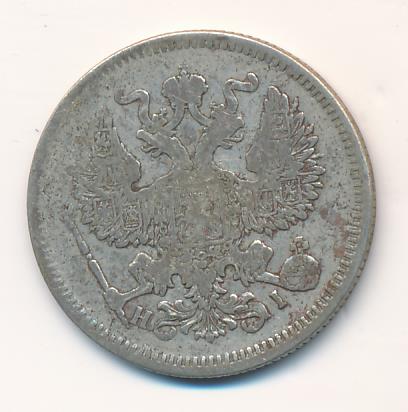 Лицевая сторона — гербовый орел, оборотная —обозначение номинала (20 копеекъ), окруженное венком из лавровой и дубовой ветвей и дата.