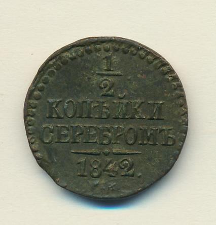 На новых монетах равенство серебряному курсу указано прямо в номинале: «1/2 КОПЕЙКИ СЕРЕБРОМ». Указ об их выпуске следует 6 сентября 1840 года («О новой медной монете на серебро 16-рублевого в пуде достоинства»). Массовая чеканка началось за год до этого на Екатеринбургском (знак ЕМ) и Сузунском (знак СМ) дворах. В качестве временной меры в 1840-1843 годах к ним подключается Ижорский завод (знак СПМ). С 1844 года после «значительного скопления медной монеты в народном обращении» в Екатеринбурге производство прекращается, а в Сузуне сокращается. Варшавский двор (знак MW), получив разрешение на выпуск общегосударственной монеты, успел отчеканить ее лишь в небольшом количестве в 1848 году.