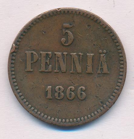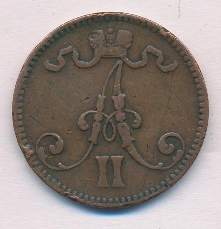 Лицевая сторона — вензель Александра II, оборотная — номинал (5 PENNIA) и дата. Нормативный вес — 6,40 грамма, гурт гладкий.