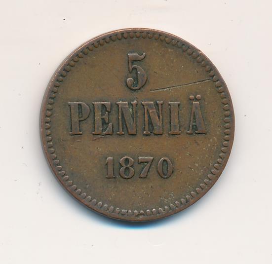 Лицевая сторона — вензель Александра II, оборотная — номинал (5 PENNIA) и дата. Нормативный вес — 6,40 грамма, гурт гладкий.