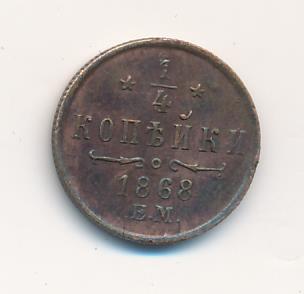 Лицевая сторона — вензель Александра II в венке из лавровой и дубовой ветвей; оборотная — обозначение номинала (1/4 копейки) и дата. Нормативный вес — 0,82 грамма, гурт рубчатый.