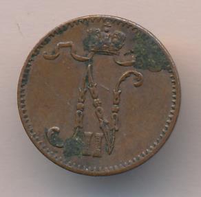 Лицевая сторона — вензель Александра II, оборотная — номинал (1 PENNIA) и дата. Нормативный вес — 1,28 грамма, гурт гладкий.