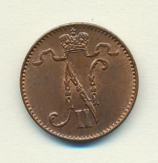 Лицевая сторона — вензель Александра II, оборотная — номинал (1 PENNIA) и дата. Нормативный вес — 1,28 грамма, гурт гладкий.