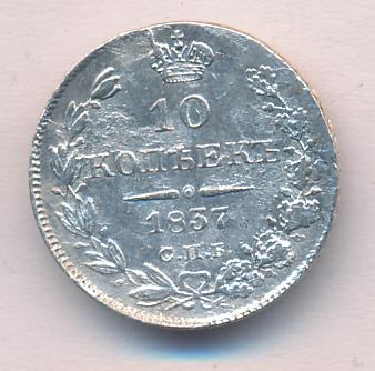 Лицевая сторона — новый гербовый орел с поднятыми крыльями, оборотная —обозначение номинала (10 копеекъ), окруженное венком из лавровой и дубовой ветвей и дата. Проба — 868, нормативный вес — 2,07 грамма.