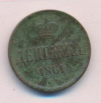 Лицевая сторона — вензель Николая I, оборотная — обозначение номинала (денежка) и дата. Нормативный вес — 2,56 грамма, гурт гладкий.