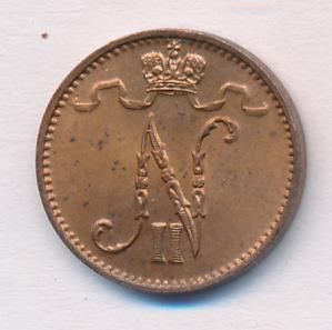 Лицевая сторона — вензель Александра II, оборотная — номинал (1 PENNIA) и дата. Нормативный вес — 1,28 грамма, гурт гладкий.
