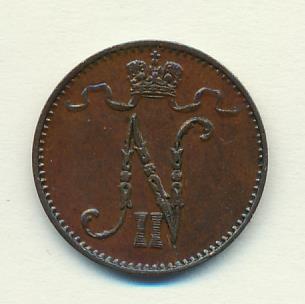 Лицевая сторона — вензель Александра II, оборотная — номинал (1 PENNIA) и дата. Нормативный вес — 1,28 грамма, гурт гладкий.
