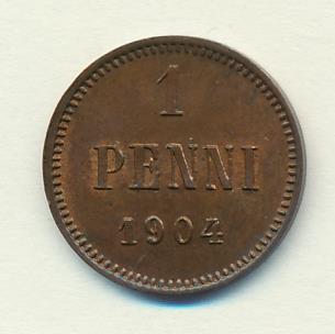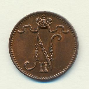Лицевая сторона — вензель Александра II, оборотная — номинал (1 PENNIA) и дата. Нормативный вес — 1,28 грамма, гурт гладкий.