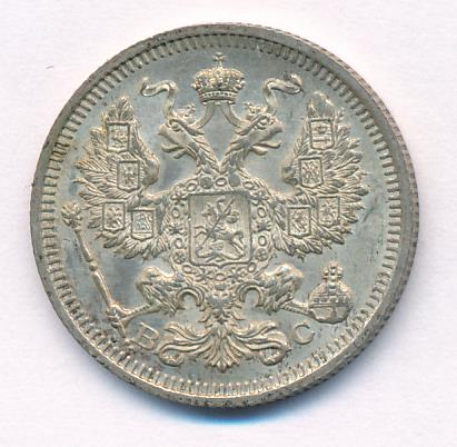 Лицевая сторона — гербовый орел, оборотная —обозначение номинала (20 копеекъ), окруженное венком из лавровой и дубовой ветвей и дата.