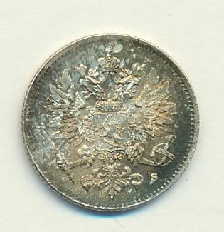 Лицевая сторона — российский двуглавый орел с гербом Великого княжества Финляндского на груди, оборотная — номинал и дата в венке из дубовых листьев. Проба — 750, нормативный вес — 1,27 грамма, гурт рубчатый.