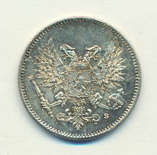 Лицевая сторона — российский двуглавый орел с гербом Великого княжества Финляндского на груди, оборотная — номинал и дата в венке из дубовых листьев. Проба — 750, нормативный вес — 1,27 грамма, гурт рубчатый.
