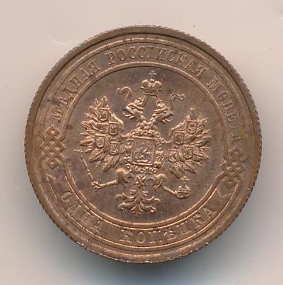 Лицевая сторона — двуглавый орел, надпись МЕДНАЯ РОССIЙСКАЯ МОНЕТА и обозначение номинала (одна копейка); оборотная — обозначение номинала (1 копейка) в бусовом ободке и дата. Нормативный вес — 3,28 грамма, гурт рубчатый.