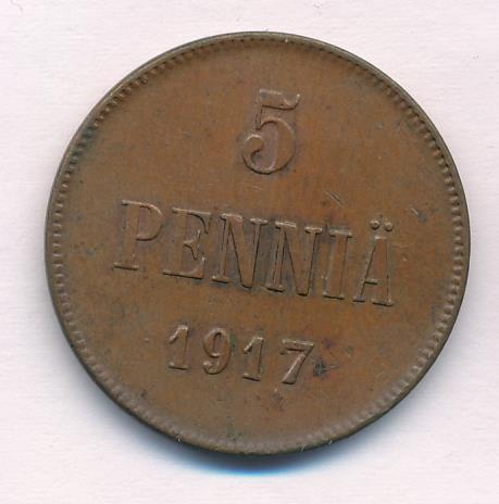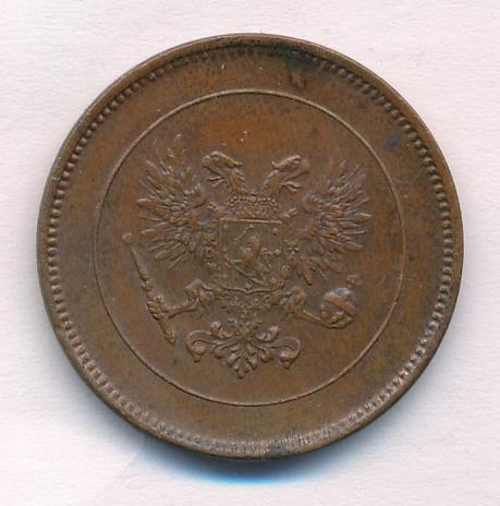 Лицевая сторона — вензель Александра II, оборотная — номинал (5 PENNIA) и дата. Нормативный вес — 6,40 грамма, гурт гладкий.