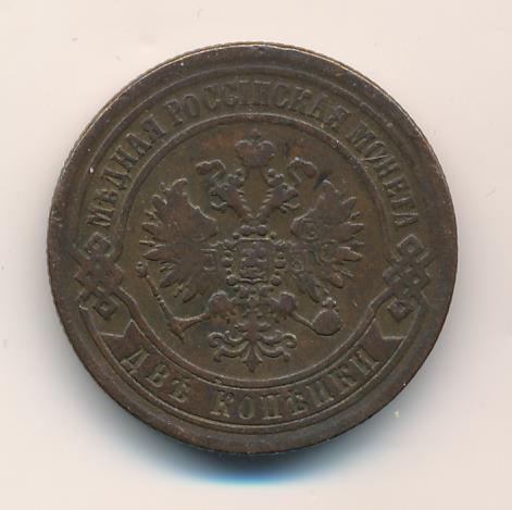 Лицевая сторона — двуглавый орел, надпись МЕДНАЯ РОССIЙСКАЯ МОНЕТА и обозначение номинала (две копейки); оборотная — обозначение номинала (2 копейки) в бусовом ободке и дата. Нормативный вес — 6,55 грамма, гурт рубчатый.