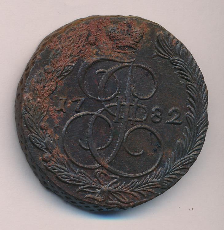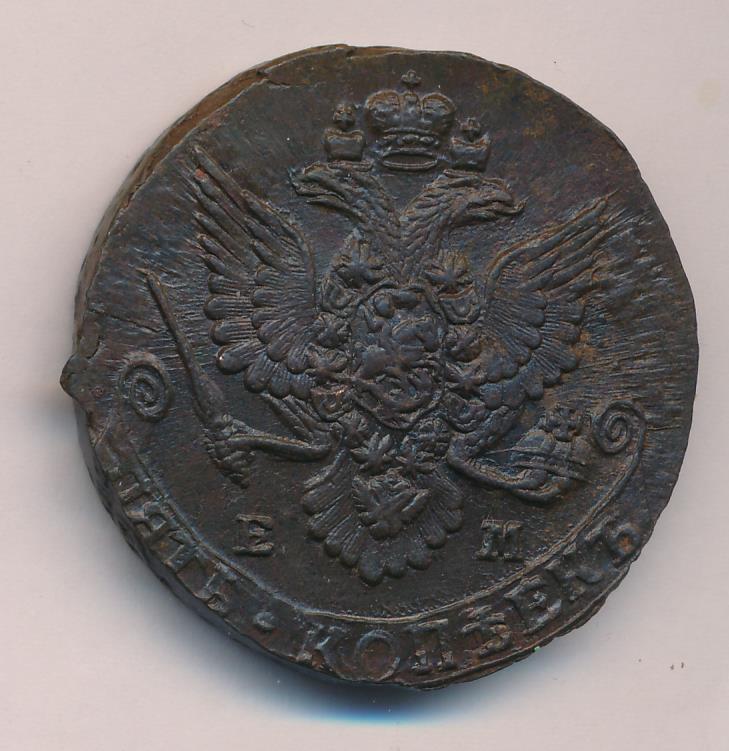 Лицевая сторона — двуглавый орел (выделяют 17 типов орла) и обозначение номинала (пять копеекъ), оборотная — вензель Екатерины II и дата. Нормативный вес — 51,19 грамма, гурт — сетка или шнур.