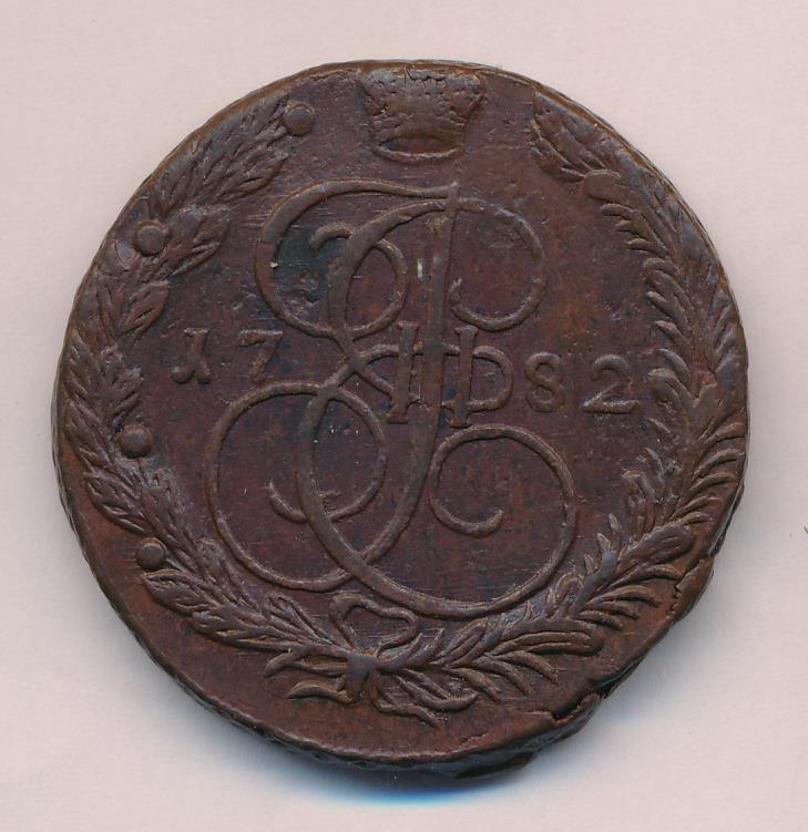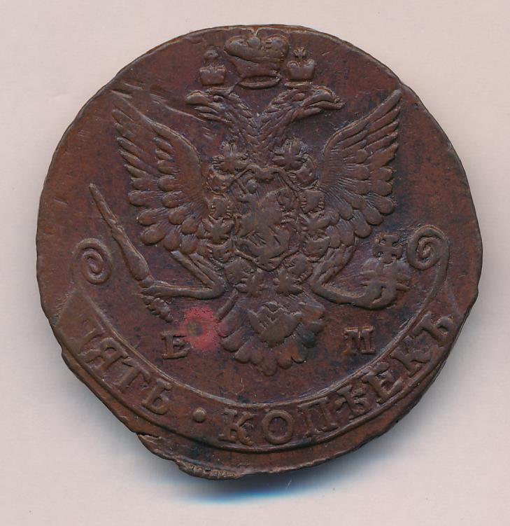 Лицевая сторона — двуглавый орел (выделяют 17 типов орла) и обозначение номинала (пять копеекъ), оборотная — вензель Екатерины II и дата. Нормативный вес — 51,19 грамма, гурт — сетка или шнур.