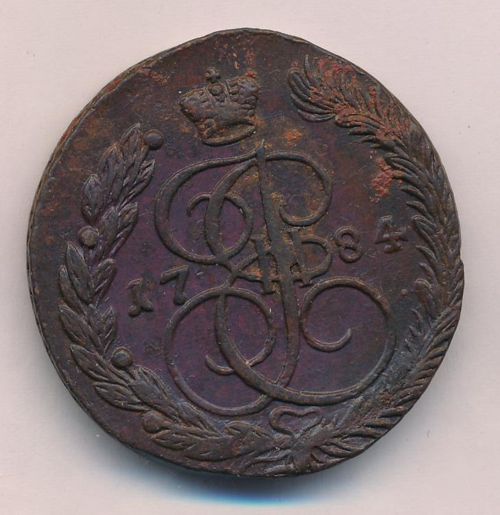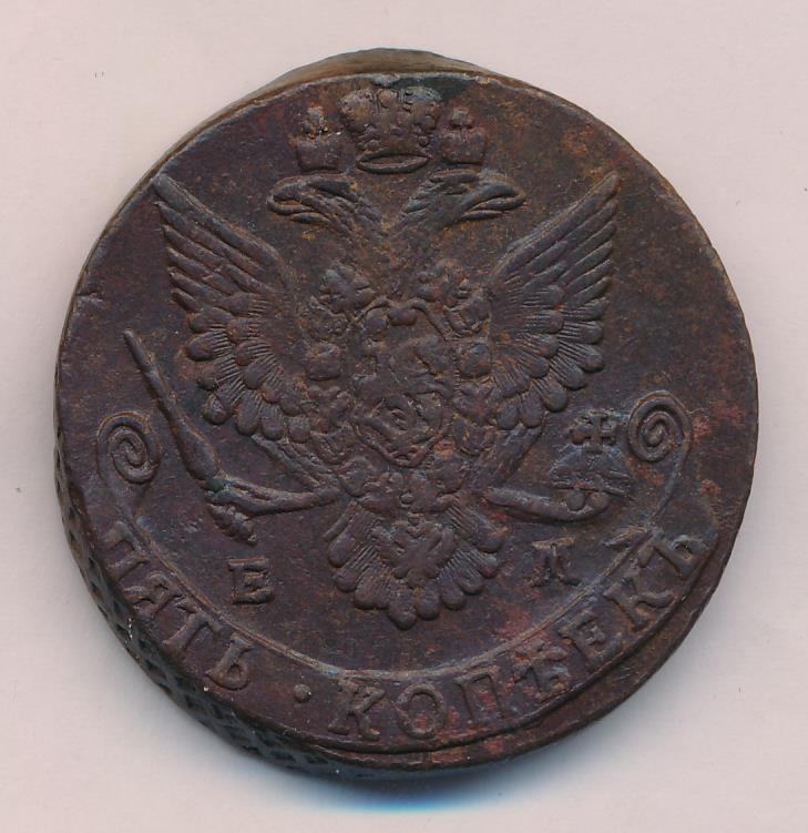 Лицевая сторона — двуглавый орел (выделяют 17 типов орла) и обозначение номинала (пять копеекъ), оборотная — вензель Екатерины II и дата. Нормативный вес — 51,19 грамма, гурт — сетка или шнур.
