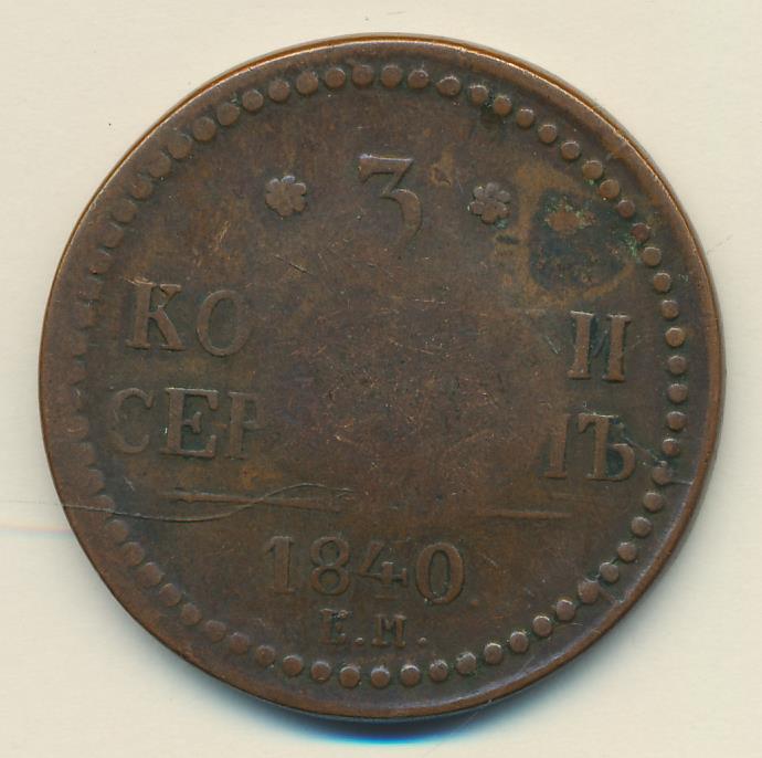 На новых монетах равенство серебряному курсу указано прямо в номинале: «3 КОПЕЙКИ СЕРЕБРОМ». Указ об их выпуске следует 6 сентября 1840 года («О новой медной монете на серебро 16-рублевого в пуде достоинства»). Массовая чеканка началось за год до этого на Екатеринбургском (знак ЕМ) и Сузунском (знак СМ) дворах. В качестве временной меры в 1840-1843 годах к ним подключается Ижорский завод (знак СПМ). С 1844 года после «значительного скопления медной монеты в народном обращении» в Екатеринбурге производство прекращается, а в Сузуне сокращается. Варшавский двор (знак MW), получив разрешение на выпуск общегосударственной монеты, успел отчеканить ее лишь в небольшом количестве в 1848 году.