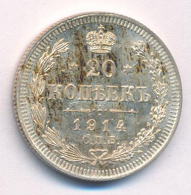 Лицевая сторона — гербовый орел, оборотная —обозначение номинала (20 копеекъ), окруженное венком из лавровой и дубовой ветвей и дата.