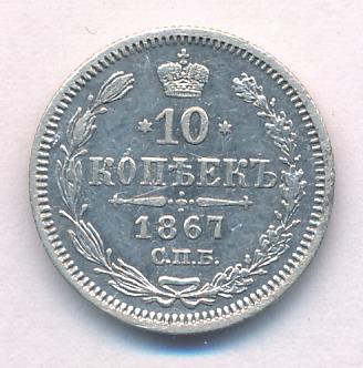 Лицевая сторона — гербовый орел, оборотная —обозначение номинала (10 копеекъ), окруженное венком из лавровой и дубовой ветвей и дата.