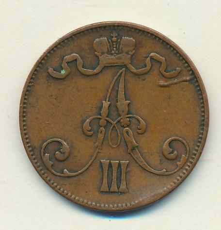 Лицевая сторона — вензель Александра II, оборотная — номинал (5 PENNIA) и дата. Нормативный вес — 6,40 грамма, гурт гладкий.