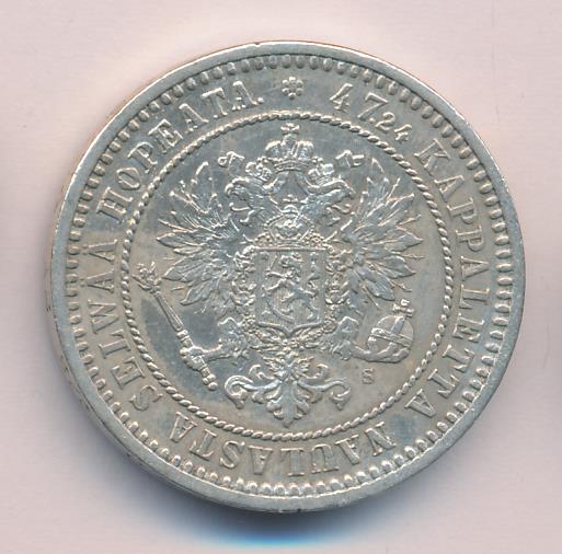 Лицевая сторона — российский двуглавый орел с гербом Великого княжества Финляндского на груди в кольцевой надписи с указанием количества штук (47,24) из фунта сплава серебра , оборотная — номинал и дата в венке из дубовых листьев. Проба — 868, нормативный вес — 10,37 грамма.