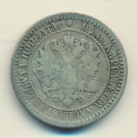Лицевая сторона — российский двуглавый орел с гербом Великого княжества Финляндского на груди в кольцевой надписи с указанием количества штук (94,48) из фунта сплава серебра, оборотная — номинал и дата в венке из дубовых листьев. Проба — 868, нормативный вес — 5,18 грамма, гурт рубчатый.