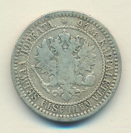 Лицевая сторона — российский двуглавый орел с гербом Великого княжества Финляндского на груди в кольцевой надписи с указанием количества штук (94,48) из фунта сплава серебра, оборотная — номинал и дата в венке из дубовых листьев. Проба — 868, нормативный вес — 5,18 грамма, гурт рубчатый.