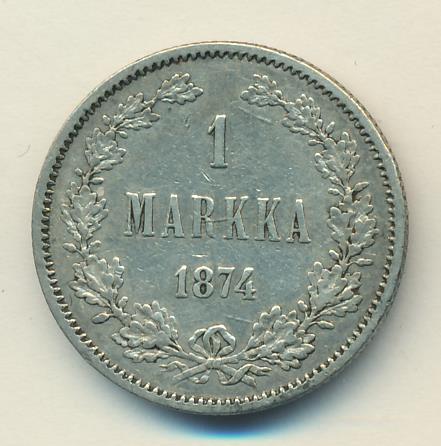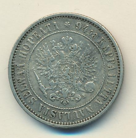 Лицевая сторона — российский двуглавый орел с гербом Великого княжества Финляндского на груди в кольцевой надписи с указанием количества штук (94,48) из фунта сплава серебра, оборотная — номинал и дата в венке из дубовых листьев. Проба — 868, нормативный вес — 5,18 грамма, гурт рубчатый.