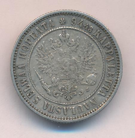 Лицевая сторона — российский двуглавый орел с гербом Великого княжества Финляндского на груди в кольцевой надписи с указанием количества штук (94,48) из фунта сплава серебра, оборотная — номинал и дата в венке из дубовых листьев. Проба — 868, нормативный вес — 5,18 грамма, гурт рубчатый.