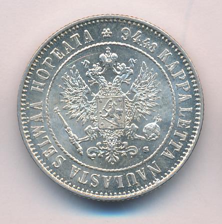Лицевая сторона — российский двуглавый орел с гербом Великого княжества Финляндского на груди в кольцевой надписи с указанием количества штук (94,48) из фунта сплава серебра, оборотная — номинал и дата в венке из дубовых листьев. Проба — 868, нормативный вес — 5,18 грамма, гурт рубчатый.