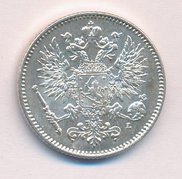 Лицевая сторона — российский двуглавый орел с гербом Великого княжества Финляндского на груди, оборотная — номинал и дата в венке из дубовых листьев. Проба — 750, нормативный вес — 2,55 грамма, гурт рубчатый.