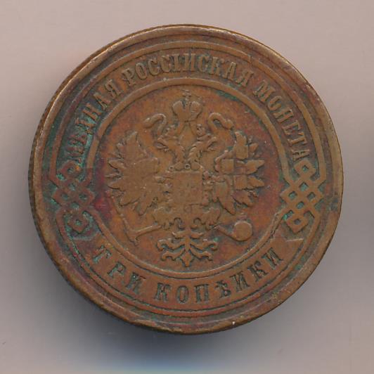 Лицевая сторона — двуглавый орел, надпись МЕДНАЯ РОССIЙСКАЯ МОНЕТА и обозначение номинала (три копейки); оборотная — обозначение номинала (3 копейки) в бусовом ободке и дата. Нормативный вес — 9,83 грамма, гурт рубчатый.