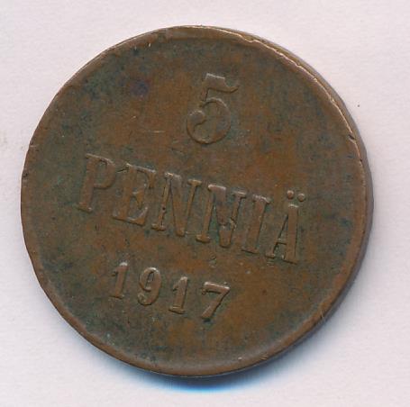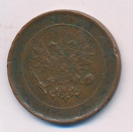 Лицевая сторона — вензель Александра II, оборотная — номинал (5 PENNIA) и дата. Нормативный вес — 6,40 грамма, гурт гладкий.
