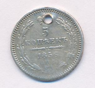 Лицевая сторона — новый гербовый орел с поднятыми крыльями, оборотная —обозначение номинала (5 копеекъ), окруженное венком из лавровой и дубовой ветвей и дата. Проба — 868, нормативный вес — 1,04 грамма.