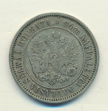 Лицевая сторона — российский двуглавый орел с гербом Великого княжества Финляндского на груди в кольцевой надписи с указанием количества штук (94,48) из фунта сплава серебра, оборотная — номинал и дата в венке из дубовых листьев. Проба — 868, нормативный вес — 5,18 грамма, гурт рубчатый.