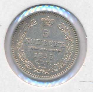 Лицевая сторона — новый гербовый орел с поднятыми крыльями, оборотная —обозначение номинала (5 копеекъ), окруженное венком из лавровой и дубовой ветвей и дата. Проба — 868, нормативный вес — 1,04 грамма.