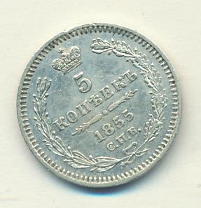 Лицевая сторона — новый гербовый орел с поднятыми крыльями, оборотная —обозначение номинала (5 копеекъ), окруженное венком из лавровой и дубовой ветвей и дата. Проба — 868, нормативный вес — 1,04 грамма.
