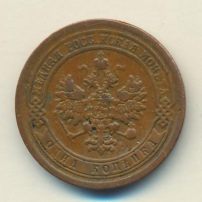 Лицевая сторона — двуглавый орел, надпись МЕДНАЯ РОССIЙСКАЯ МОНЕТА и обозначение номинала (одна копейка); оборотная — обозначение номинала (1 копейка) в бусовом ободке и дата. Нормативный вес — 3,28 грамма, гурт рубчатый.