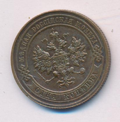 Лицевая сторона — двуглавый орел, надпись МЕДНАЯ РОССIЙСКАЯ МОНЕТА и обозначение номинала (одна копейка); оборотная — обозначение номинала (1 копейка) в бусовом ободке и дата. Нормативный вес — 3,28 грамма, гурт рубчатый.
