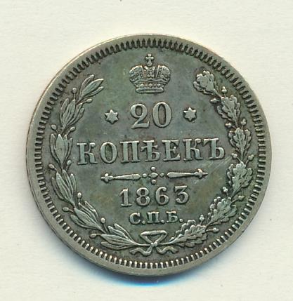 Лицевая сторона — гербовый орел, оборотная —обозначение номинала (20 копеекъ), окруженное венком из лавровой и дубовой ветвей и дата.