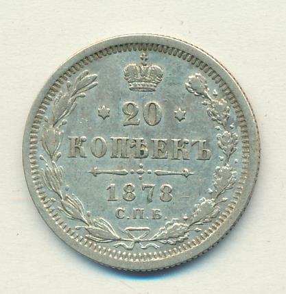 Лицевая сторона — гербовый орел, оборотная —обозначение номинала (20 копеекъ), окруженное венком из лавровой и дубовой ветвей и дата.