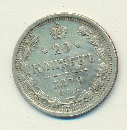 Лицевая сторона — гербовый орел, оборотная —обозначение номинала (20 копеекъ), окруженное венком из лавровой и дубовой ветвей и дата.