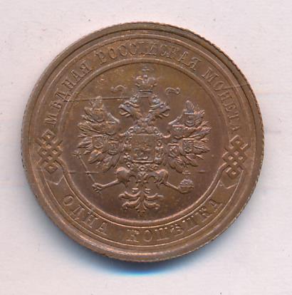 Лицевая сторона — двуглавый орел, надпись МЕДНАЯ РОССIЙСКАЯ МОНЕТА и обозначение номинала (одна копейка); оборотная — обозначение номинала (1 копейка) в бусовом ободке и дата. Нормативный вес — 3,28 грамма, гурт рубчатый.
