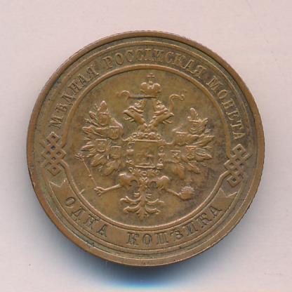 Лицевая сторона — двуглавый орел, надпись МЕДНАЯ РОССIЙСКАЯ МОНЕТА и обозначение номинала (одна копейка); оборотная — обозначение номинала (1 копейка) в бусовом ободке и дата. Нормативный вес — 3,28 грамма, гурт рубчатый.