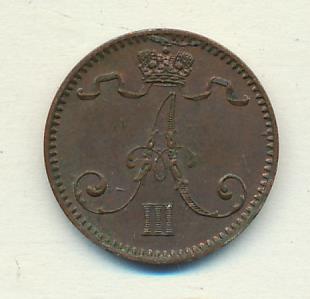 Лицевая сторона — вензель Александра II, оборотная — номинал (1 PENNIA) и дата. Нормативный вес — 1,28 грамма, гурт гладкий.
