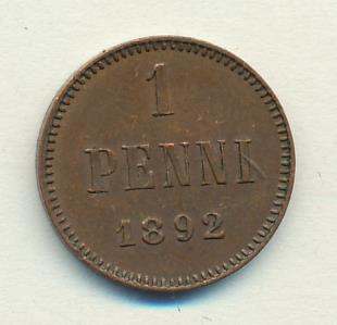 Лицевая сторона — вензель Александра II, оборотная — номинал (1 PENNIA) и дата. Нормативный вес — 1,28 грамма, гурт гладкий.