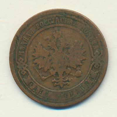 Лицевая сторона — двуглавый орел, надпись МЕДНАЯ РОССIЙСКАЯ МОНЕТА и обозначение номинала (одна копейка); оборотная — обозначение номинала (1 копейка) в бусовом ободке и дата. Нормативный вес — 3,28 грамма, гурт рубчатый.