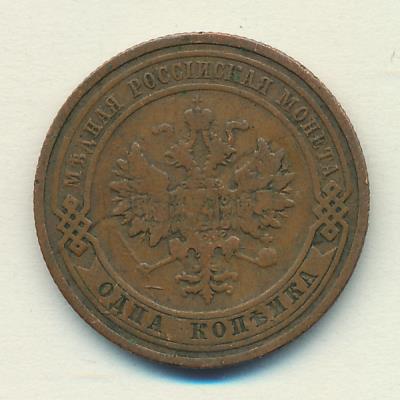 Лицевая сторона — двуглавый орел, надпись МЕДНАЯ РОССIЙСКАЯ МОНЕТА и обозначение номинала (одна копейка); оборотная — обозначение номинала (1 копейка) в бусовом ободке и дата. Нормативный вес — 3,28 грамма, гурт рубчатый.