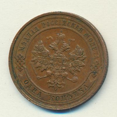 Лицевая сторона — двуглавый орел, надпись МЕДНАЯ РОССIЙСКАЯ МОНЕТА и обозначение номинала (одна копейка); оборотная — обозначение номинала (1 копейка) в бусовом ободке и дата. Нормативный вес — 3,28 грамма, гурт рубчатый.